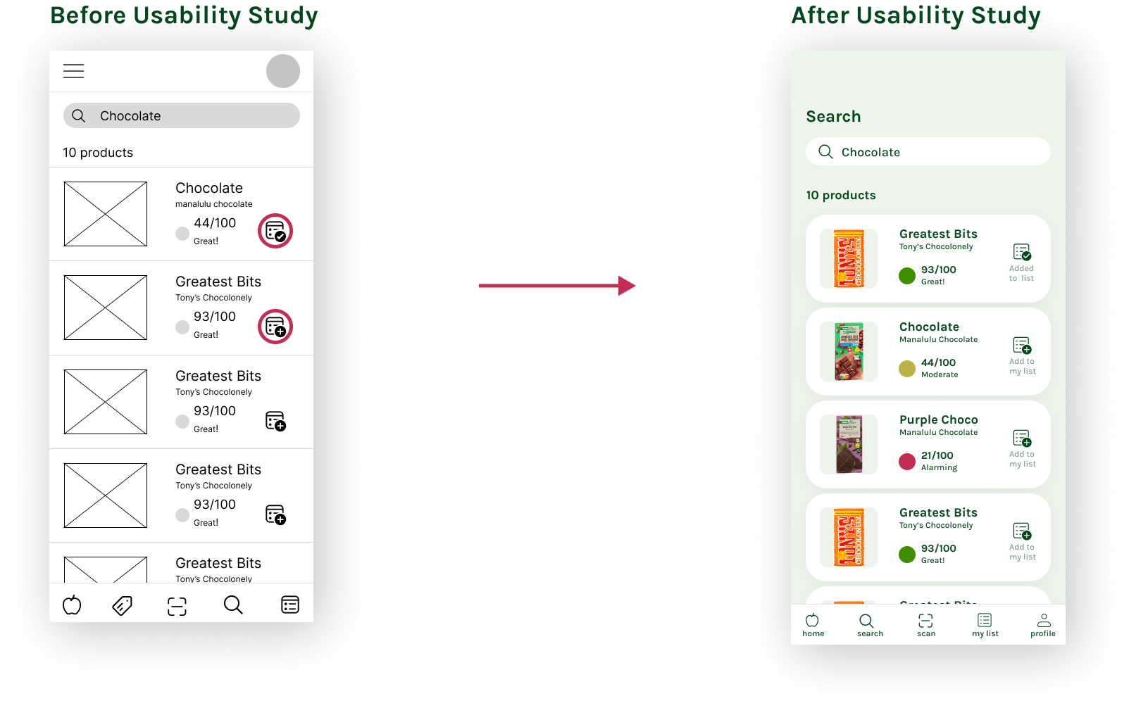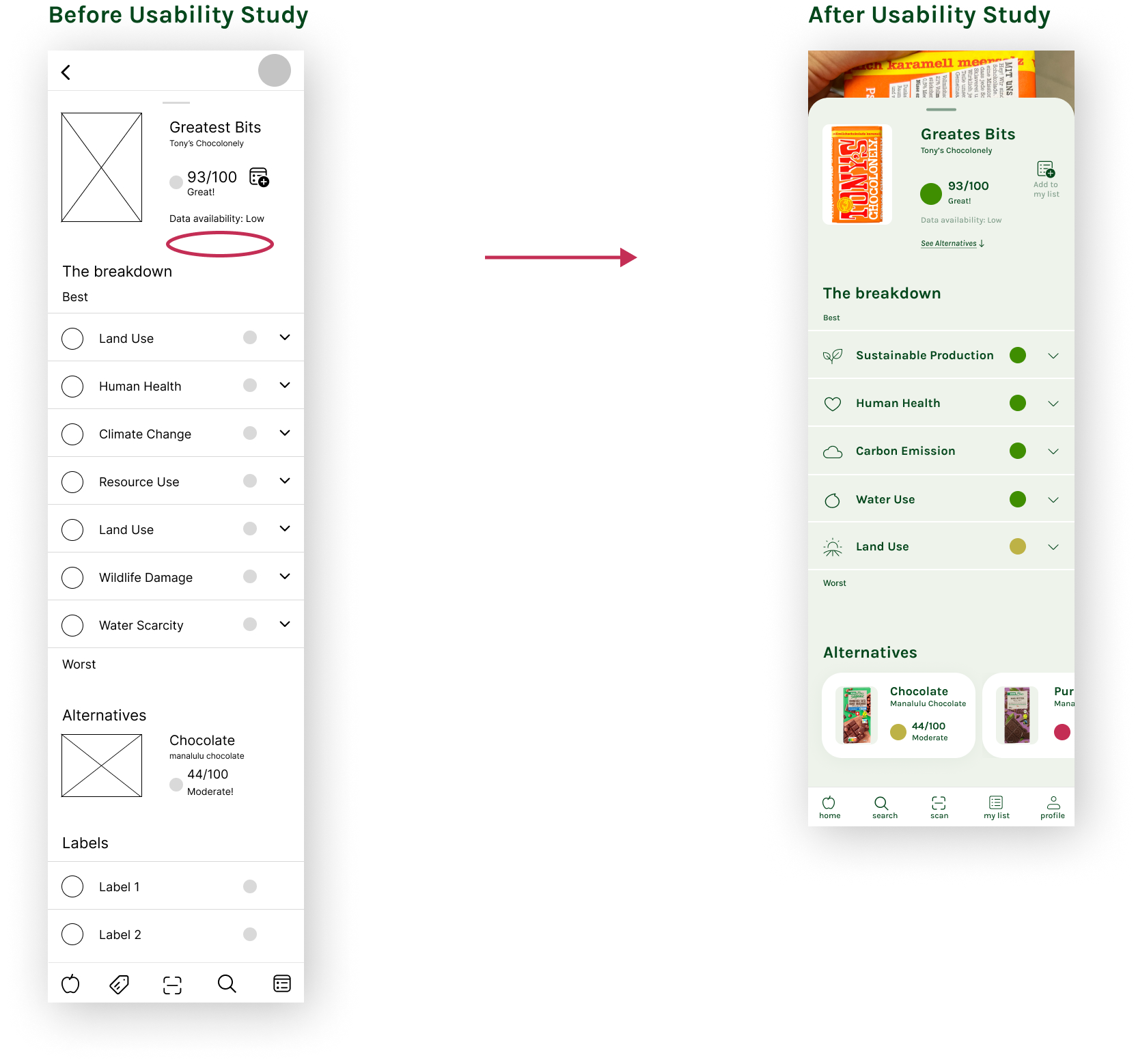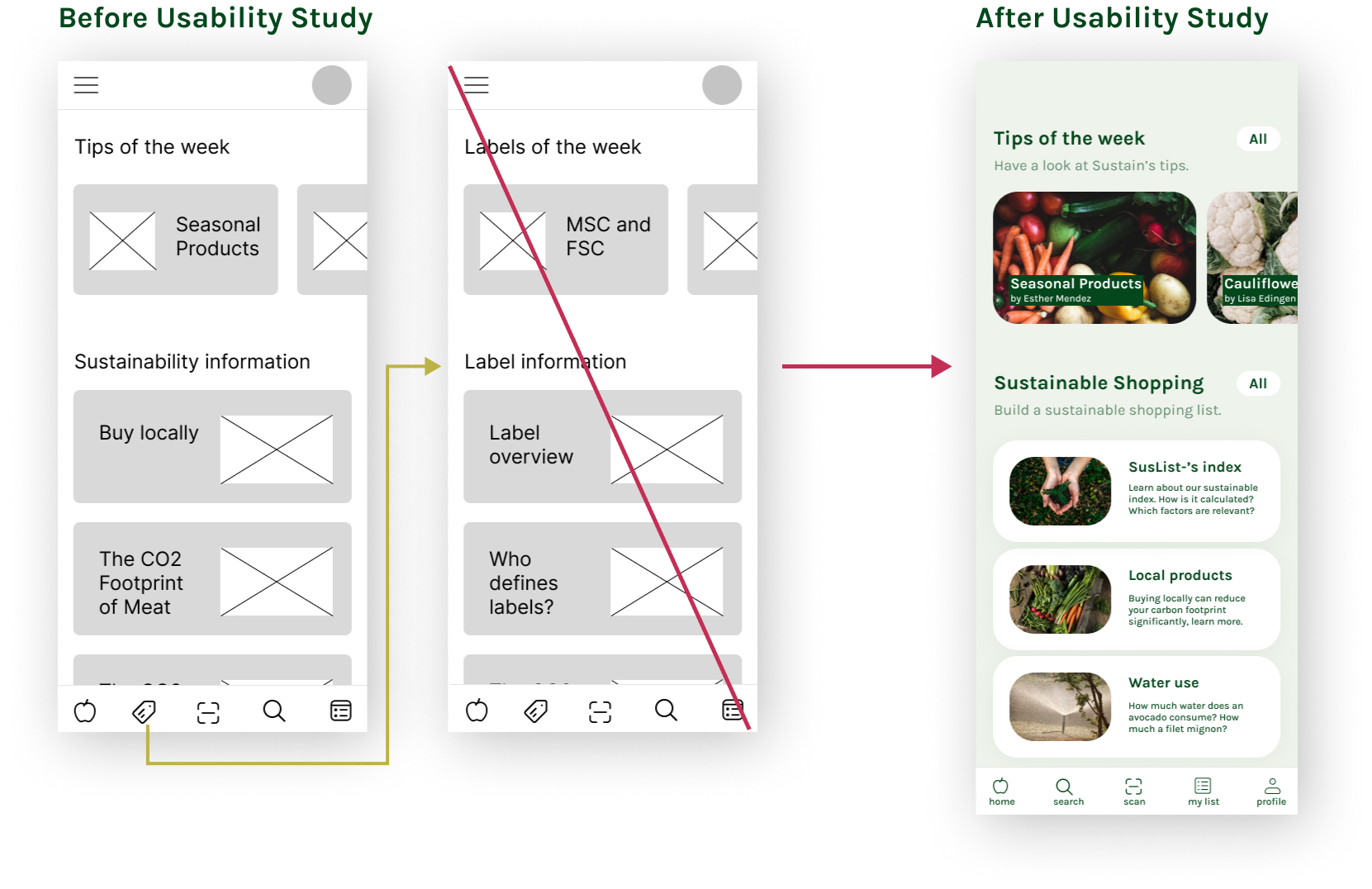 I designed the app leaner by removing the label page and emphasizing the homepage as a unique starting point. This strengthened users’ perception of SusList’s purpose to enable sustainable purchasing decisions and to build a sustainable shopping list.